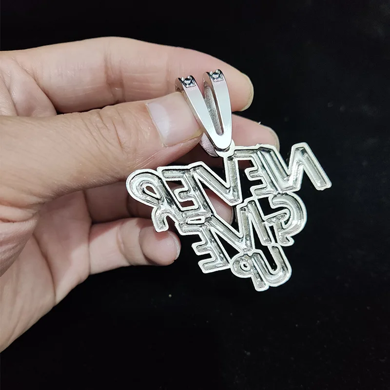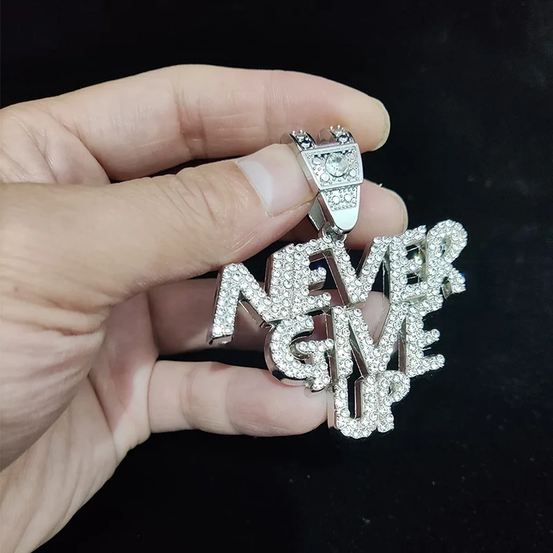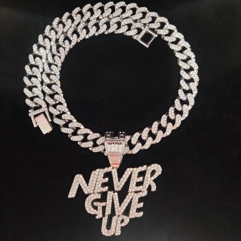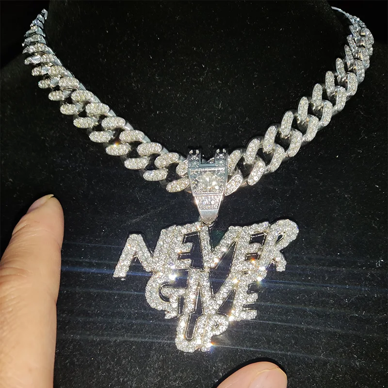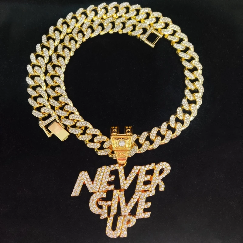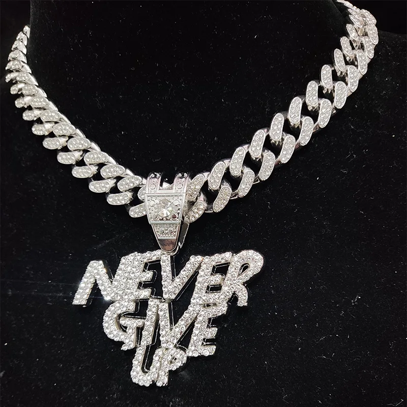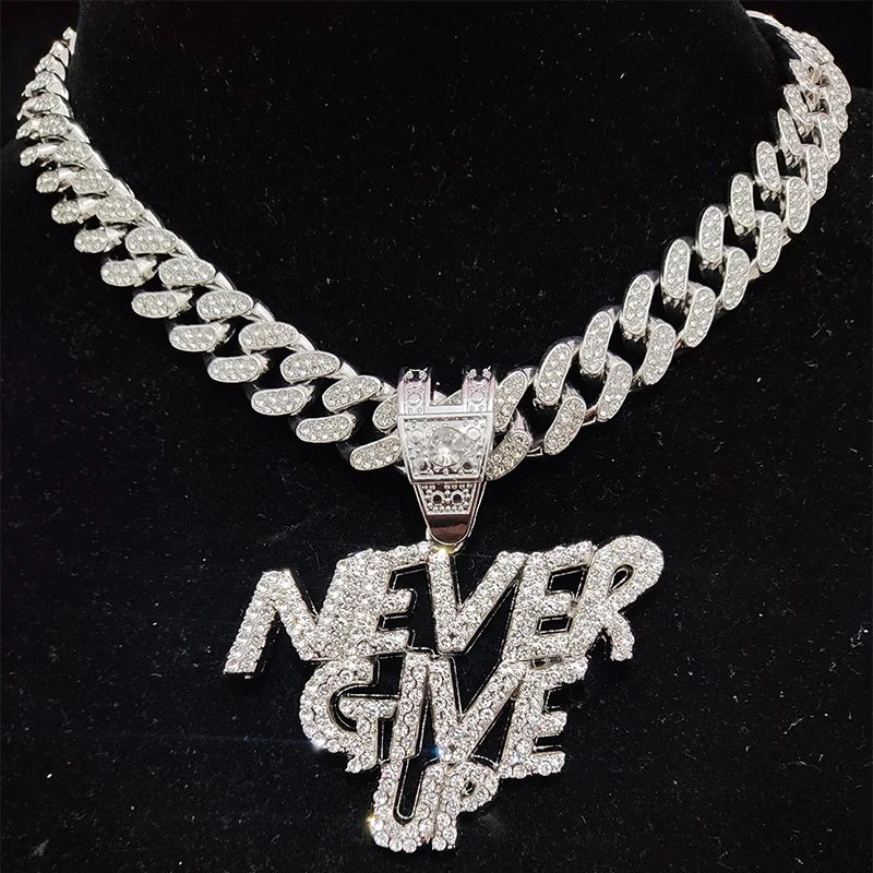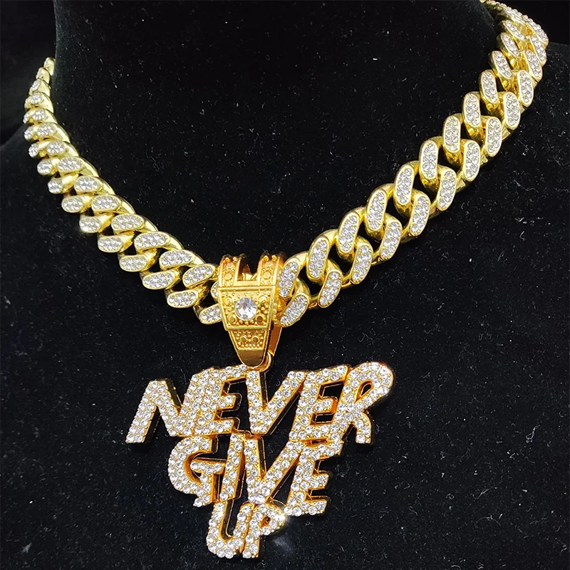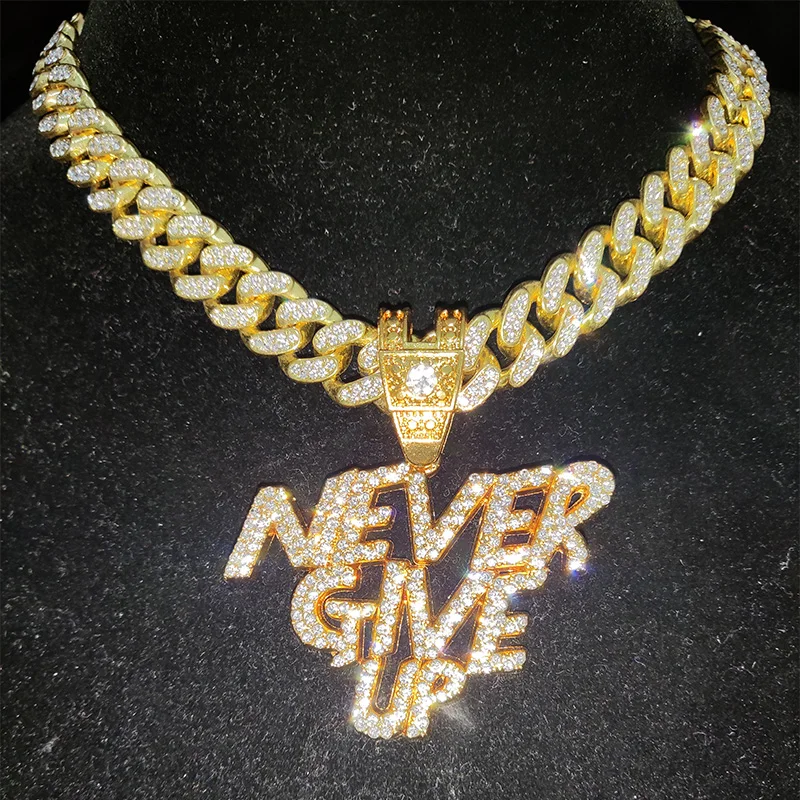 Men Women Hip Hop NEVER GIVE UP Pendant Necklace 13mm Crystal Cuban Chain HipHop Iced Out Bling Necklaces Fashion Charm Jewelry